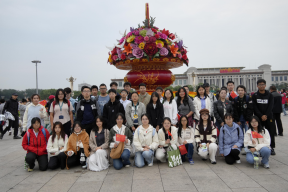 同学们满怀着激动的心情,挥舞着手中的国旗,在天安门广场的巨大花篮前合影留念。